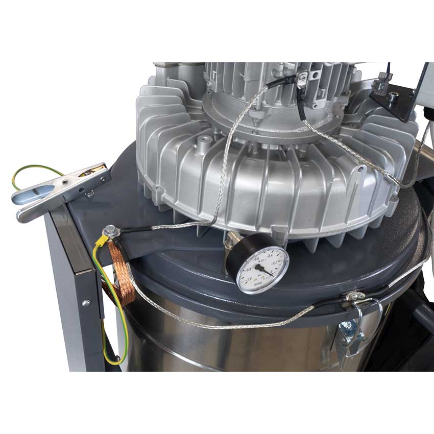 sistema de puesta a tierra con resistencia inferior a 10 Ohm, pinza de conexión a tierra con cable de 3 metros, deflector interno de polvo con lámina de latón antichispas, difusor de salida de aire antiestático, sacudidor de filtro con componentes disipadores y válvula rompevacío de serie para evitar el sobrecalentamiento de la turbina.